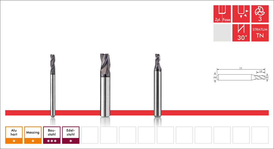 | Artikel-Nr. | D1 – Ø Schneide | D2 – Ø Schaft | L2 – Länge Schneide | L1 – Länge Gesamt | Bemerkungen | Preis EUR |