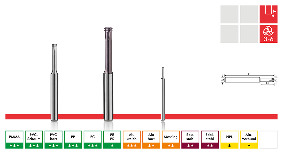 | Artikel-Nr. | Gewinde | D1 – Ø Schneide | D2 – Ø Schaft | L3 – Freischliff | L1 – Länge Gesamt | Bemerkungen | Preis EUR |