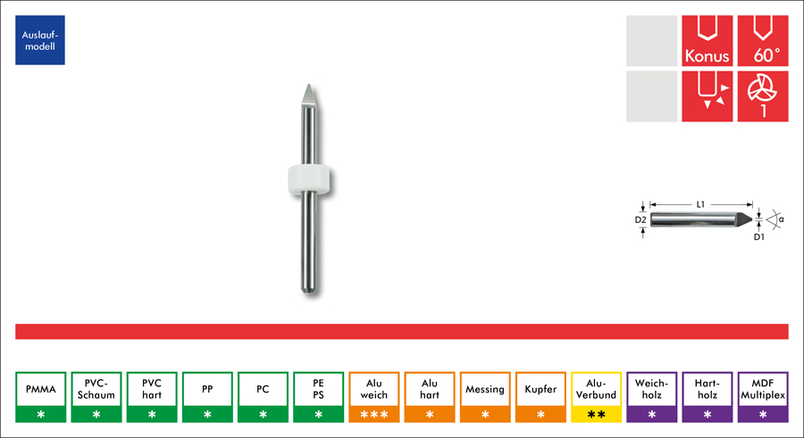 | Artikel-Nr. | α – Spitzenwinkel | D3 – Gravurbreite | D2 – Ø Schaft | L1 – Länge Gesamt | Preis EUR | Ihr Preis in EUR | -5% ≥ 2 | -10% ≥ 5 | -15% ≥ 10 | -20% ≥ 20 | Bestellmenge | ||