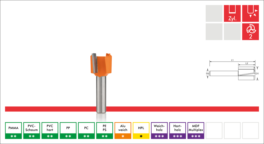 Artikel-Nr. | D1 – Ø Schneide | D2 – Ø Schaft | L2 – Länge Schneide | L1 – Länge Gesamt | Preis EUR |
