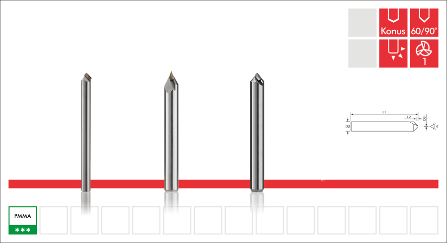 | Artikel-Nr. | α – Spitzenwinkel | D3 – Gravurbreite | D2 – Ø Schaft | L2 – max. Eintauchtiefe | L1 – Länge Gesamt | Bemerkungen | Preis EUR |