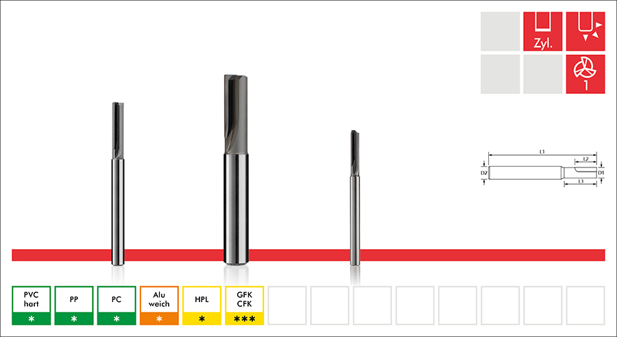 Artikel-Nr. | D1 – Ø Schneide | D2 – Ø Schaft | L2 – Länge Schneide | L3 – Freischliff | L1 – Länge Gesamt | Preis EUR |