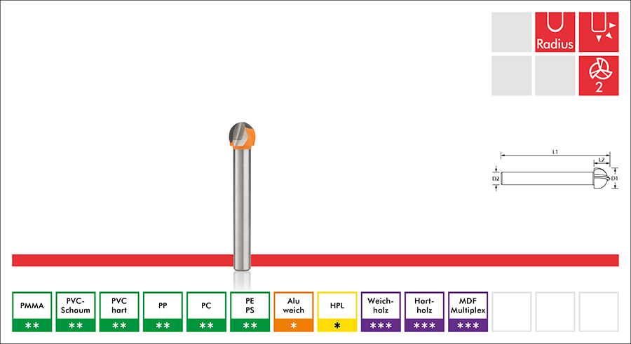 | Artikel-Nr. | D1 – Ø Schneide | D2 – Ø Schaft | L2 – Länge Schneide | L1 – Länge Gesamt | Preis EUR | Ihr Preis in EUR | -5% ≥ 2 | -10% ≥ 5 | -15% ≥ 10 | -20% ≥ 20 | Bestellmenge | ||