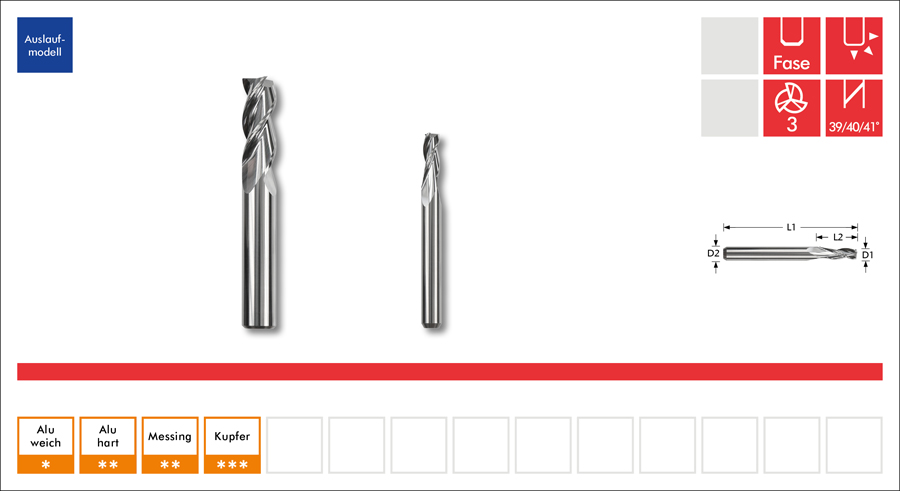 | Artikel-Nr. | Eckenfase | D1 – Ø Schneide | D2 – Ø Schaft | L2 – Länge Schneide | L1 – Länge Gesamt | Preis EUR | Ihr Preis in EUR | -5% ≥ 2 | -10% ≥ 5 | -15% ≥ 10 | -20% ≥ 20 | Bestellmenge | ||
