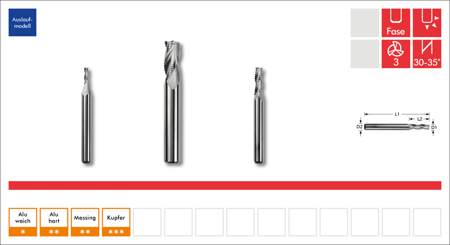 | Artikel-Nr. | Anzahl Zähne | Eckenfase | D1 – Ø Schneide | D2 – Ø Schaft | L2 – Länge Schneide | L1 – Länge Gesamt | Preis EUR | Ihr Preis in EUR | -5% ≥ 2 | -10% ≥ 5 | -15% ≥ 10 | -20% ≥ 20 | Bestellmenge | ||
