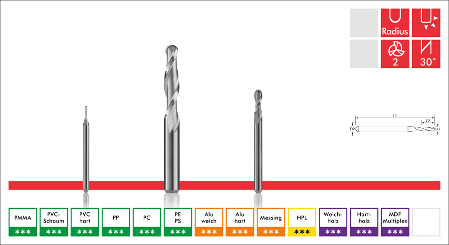 Artikel-Nr. | D1 – Ø Schneide | D2 – Ø Schaft | L2 – Länge Schneide | L1 – Länge Gesamt | Stirnradius | Preis EUR |